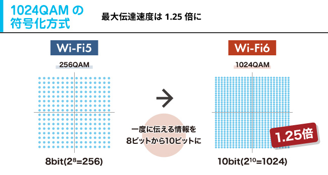 QAM(直角位相振幅変調)は、位相差と振幅で複数のビットを同時に送信する変調方式です。Wi-Fi5では最大256QAM、一度に8bitの送信でしたが、Wi-Fi6では新たに1024QAMまで追加。一度に10bitのデータを同時に送れるようになり、結果1.25倍の通信速度向上が実現されました。