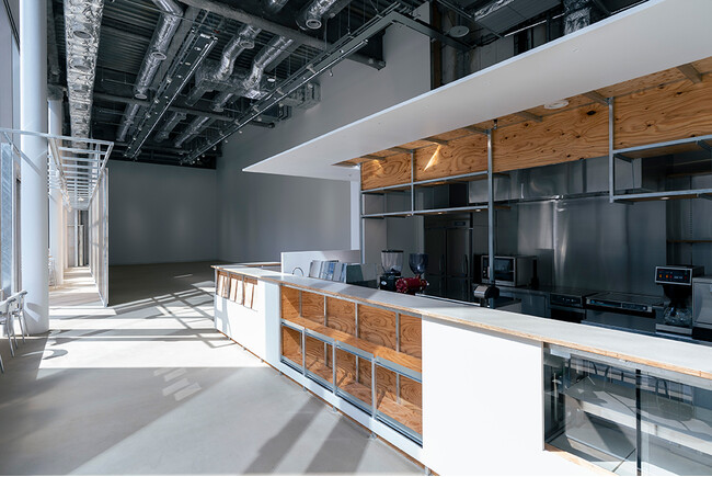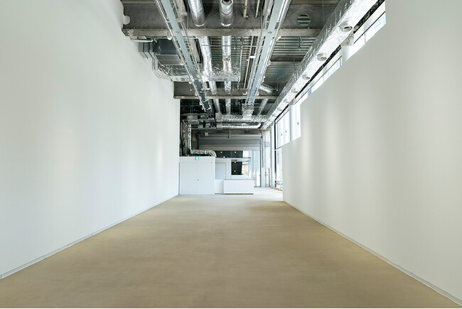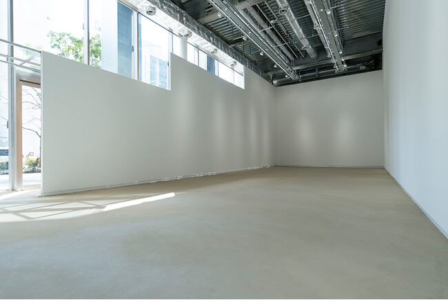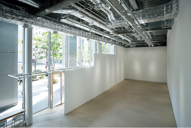 段状の形が印象的な展示壁は、外から展示の様子が垣間見え、大通り側の壁面も造作が可能なつくりになっています。一番低い壁面でも高さが3mあり、一般的な展示壁としても十分な高さと面積があります。展示空間として成立させながらも、作品やアーティストの活動が、外とつながり、広がっていくことを促すような設計になっています。
