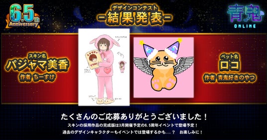 6.5周年イベントのキャンペーンの1つとして2/3(月)~2/17(月)まで実施していた「6.5周年美香デザイン、ペットデザインコンテスト」において、応募作品から選ばれた「パジャマ美香」「ロコ」が青鬼オンラインのスキンとペットして登場いたします。限定チャレンジや6.5周年の塔の報酬スキンにて登場するのでぜひたくさん遊んでください。