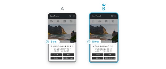 旅行会社のサイトで旅のテーマ別に案内するポップアップの表示までの秒数をA/Bテストしました。ユーザーがページを訪れてから5秒後に表示したパターンと10秒後に表示したパターンで比べ、10秒後に表示したパターンが効果的でした。