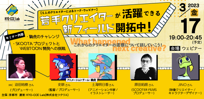 株式会社ツクリエ(本社:東京都千代田区 代表取締役:鈴木英樹 以下ツクリエ)が、京都市より運営受託するKYO-CCE Lab(京シーシーイーラボ)では、京都在住のアニメーターやプロデューサーなどの活動、展望、課題などをテーマにした企画の第1弾として、エンタメクリエイティブの分野で新しいフィールドの開拓や、チャレンジをしているクリエイターのトークイベント「若手クリエイターが活躍できる新フィールド開拓中!」を、3月17日(金)にオンラインで開催します。