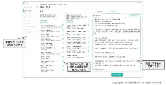 株式会社カケハシ(本社:東京都港区、代表取締役社長:中尾 豊、代表取締役CEO:中川 貴史、以下、当社)は、クラウド型電子薬歴「Musubi」(以下、Musubi)において、在宅医療の現場での業務を支援する「在宅訪問サポート機能」の提供を開始しました。訪問時の必要情報が集約された1画面表示、患者情報のワンタッチ切り替えなど、現場実務に即した各種機能により、ニーズが高まる在宅医療における薬剤師の業務負担を軽減するとともに、患者さんと向き合う時間の創出をサポートします。今後も機能の継続的な拡充を行い、在宅医療における薬剤師の職能発揮に貢献します。