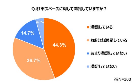 駐車スペースの利用者に対して満足度を尋ねたところ、「満足している」(44.3%)、「おおむね満足している」(36.7%)