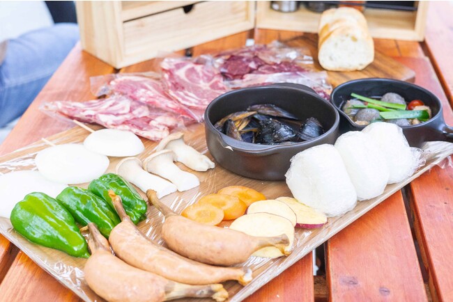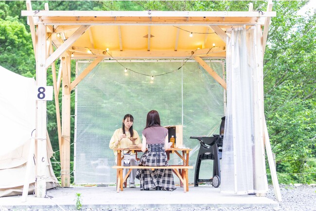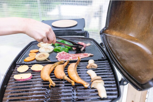 テント前の屋根のついたウッドデッキにて、BBQをお楽しみいただけるので、雨の日でも安心なのがうれしいポイント。ガスグリルは、BBQ本場アメリカweber社のものを使用しており、着火・準備・片付けなどは全てスタッフが行うため、はじめての方でも無理なくお楽しみいただけます。調味料・お皿もすべて用意しているため、事前に食材や食器を持ってくる必要もありません。