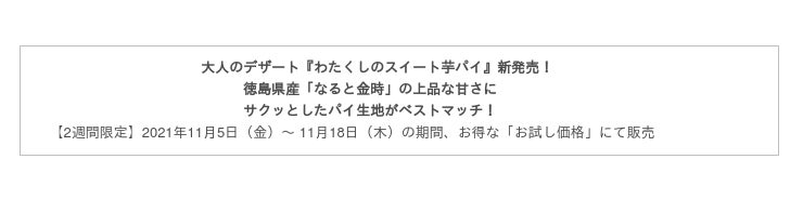 同日より『わたくしのスイート芋パイ』のおいしさを多くの方にお試しいただきたく、11月5日(金)~11月18日(木)の2週間限定で20円引きのお得な「お試し価格」にて販売いたします。