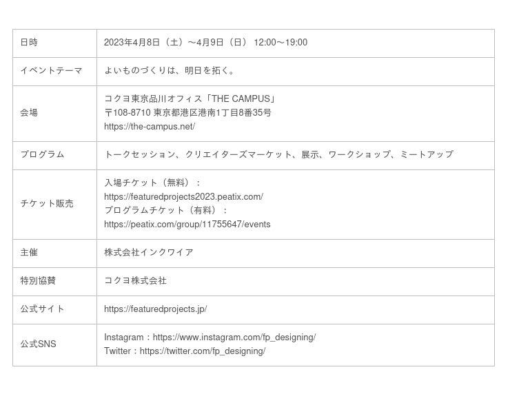 コミュニティ構築支援とポップアップ企画に特化したクリエイティブカンパニー株式会社qutori(CEO:加藤 翼、本社:東京都渋谷区、以下:qutori)はコクヨ株式会社東京品川オフィス『THE CAMPUS』で2023年4月8日(土)から9日(日)の2日間にわたって開催される「Featured Projects 2023」(主催:株式会社インクワイア)に協賛することをお知らせします。