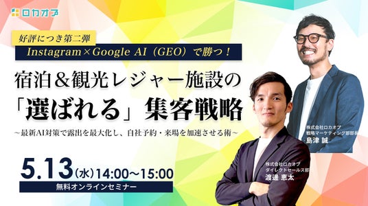 株式会社ロカオプ(本社:大阪府大阪市 代表取締役:縣将貴、以下:ロカオプ)は、5月13日(水)14:00より無料のオンラインセミナー『【好評につき第二弾】Instagram×Google AI(GEO)で勝つ!宿泊&観光レジャー施設の「選ばれる」集客戦略 ~最新AI対策で露出を最大化し、自社予約・来場を加速させる術~』を開催いたします。