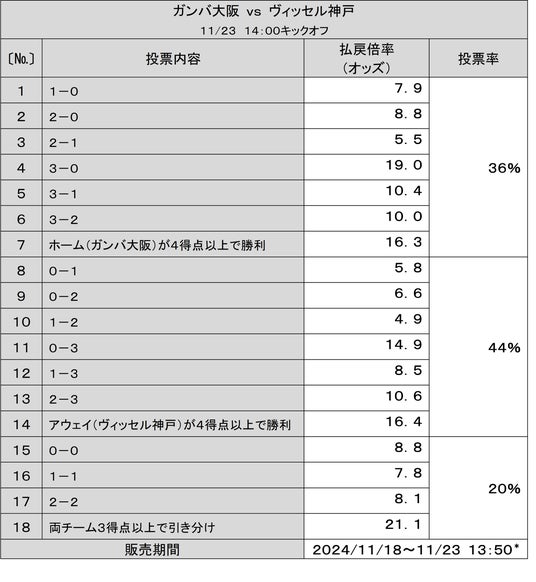 - 「WINNERサッカー1試合予想(ガンバ大阪 vs ヴィッセル神戸)」の投票状況(11月22日(金)10時時点)