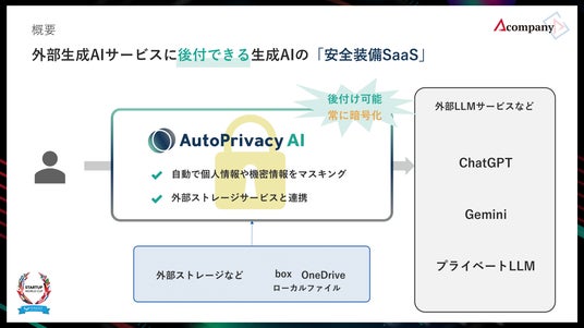 今回の「スタートアップワールドカップ2025 東京予選」では、生成AIの安全装置SaaS 『AutoPrivacy AI』についてご紹介しました。『AutoPrivacy AI』は、Acompanyが強みとする秘密計算をコアに、自動で個人情報や機密情報をマスキングすることを可能にしました。