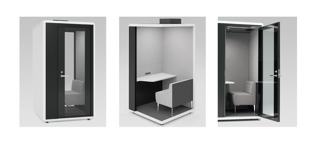 「テレキューブ」は、ブイキューブが2017年より「Web会議の場所がない」問題を解決するために提供開始した、さまざまな場所に容易に設置できる、防音個室ブースです。内部にはテーブル、イス、電源コンセントなどが設置されており、セキュリティが保たれた静かな環境で、資料作成やメールなどの業務、電話やWeb会議などでのコミュニケーションが可能です。個人で作業を行うソロ、1on1など少人数でのミーティングを行うグループ1型、多人数での打合せを行うグループ2型をラインアップしています。