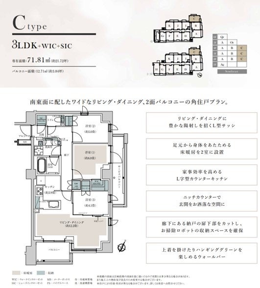 とセキュリティ性に配慮した「内廊下」設計を採用。プランは3LDK70平方メートル 超南東・南西向き