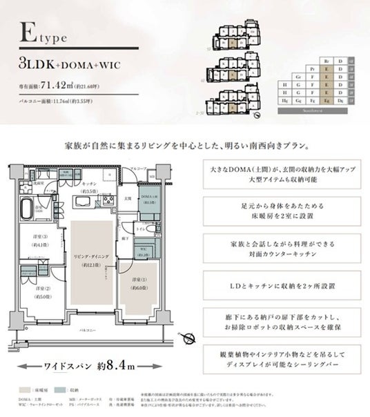 3LDK 70平方メートル 超 南東・南西向き住戸は全52戸中27戸。(南東向き住戸12戸、南西向き住戸15戸)。