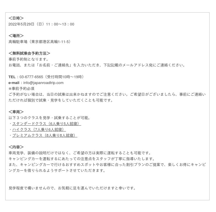 キャンピングカーレンタルJAPAN ROAD TRIP(運営会社:株式会社エアサポ 本社:東京都港区芝4-3-11 VORT三田駅前3F、代表取締役:小寺詩帆)は、キャンピングカーレンタルがはじめての方向けに、5/29(日)11:00~無料試乗会を開催いたします。