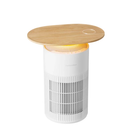 「置き場所を考える」のではなく、「置きたくなる家電」としての価値を意識し、木目調の美しいフォルムでサイドテーブルとしてもお使いいただける空気清浄機です。空気質を示す4色の表示ライトは間接照明にもなり、お好みのアロマオイルを入れてお使いいただくだけで、アロマディフューザーにも◎。また、スマホを置くだけで充電できるワイヤレス充電機能を搭載。360°全方向型の吸気口を特徴とした円筒状のデザインなので、壁側に限らずどこにでも設置いただけて、吸気に偏りが生まれません。臭いの元を強力に消臭する活性炭の採用や防水設計でペットのいるご家庭にもおすすめ。製品ページ:https://switchbot.vip/40TmB6D