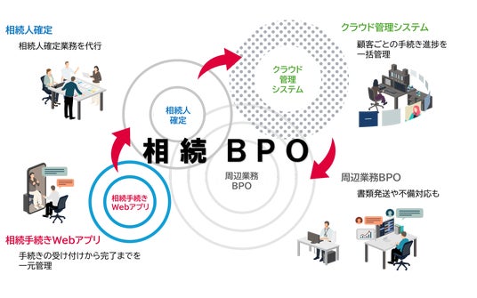 「相続事務支援BPOサービス」は当社が2020年より提供開始している、相続手続き業務を一括でサポートする仕組みです。受け付けWebフォームの構築から、戸籍および法定相続情報一覧図の読み取り・審査、相続関係図の作成による相続人の特定までをワンストップで支援します。また、手続き工程の進捗管理システムを通じて、リアルタイムで個々の顧客手続きの進行チェックやサポートを可能にするなど、CRMの視点からも金融機関の業務改革に貢献するサービスです。