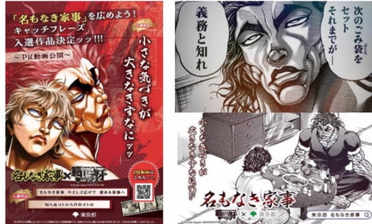 家事・育児に係る意識改革・行動変容のため、「名もなき家事」(「シャンプーの詰め替え」「トイレットペーパーの補充」など、具体的な名前はないが生活に欠かせない家事のこと)の認知、理解促進を目的に都民の声やアイデアなどを募集し、入選作品で広報物を作成する取組を実施しました。募集アイデアをコアターゲットである男性に届けるため、板垣恵介先生の大人気格闘漫画『範馬刃牙』(秋田書店「少年チャンピオン・コミックス」刊)とコラボし、親子の対話で動画を構成することで、ターゲット層が受け取りやすい内容としました。その結果、動画は公開約1か月で55万PVを達成しました。生活文化スポーツ局が2024年6月27日から8月31日まで実施した「『名もなき家事』あなたの声・アイデア大募集!!」では、「名もなき家事」に関するエピソードやキャッチフレーズ、ネーミング案を募集。「キャッチフレーズ部門」「ネーミング部門」で4名の審査員による選考会を実施し、キャッチフレーズ3作品、ネーミング5作品を決定しました。名もなき家事」の声・アイデア募集には、2,027件の応募がありました。