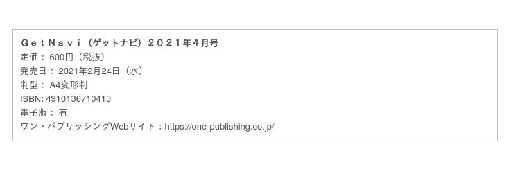 株式会社 ワン・パブリッシング(東京都台東区/代表取締役社長:廣瀬有二)は、『Get Navi 2021年 04 月号』を発売いたしました。『プロが選んだ殿堂入り100銘品』では、各分野の“モノ知り”たち総勢68名が集結。それぞれの「殿堂入り」アイテムを熱烈レコメンドします!その他、『ユニクロ&ジーユー名品ランキング』『【緊急特集】2021年の超防災メソッド』など、今月も新情報を盛りだくさんでお届けします。