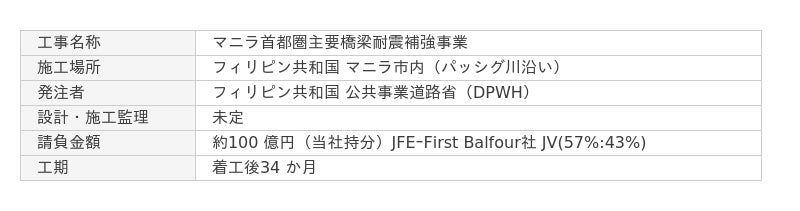 JFEエンジニアリング株式会社(社長 福田 一美、本社 東京都千代田区)は、このたび、フィリピン共和国 公共事業道路省から「マニラ首都圏主要橋梁耐震補強工事(以下:本工事)」を受注しました。