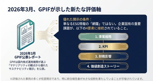2026年3月、GPIFは国内株式運用機関が選ぶ「マテリアリティの観点から優れたサステナビリティ開示」を公表し、投資家が高く評価する開示の方向性を示しました。そこでは、単なるESG情報の網羅ではなく、企業固有の重要課題が、事業戦略、KPI、財務影響、価値創造ストーリーへと接続されているかが重要なポイントとなっています。