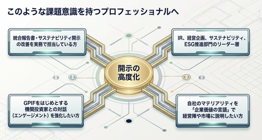 本セミナーでは、このGPIFの最新視点を踏まえ、企業が今後どのようにマテリアリティ開示を高度化し、資本市場との対話力を高めていくべきかを解説します。特に、マテリアリティの特定にとどまらず、非財務情報を財務・企業価値へどう翻訳するかという視点から、統合報告書やサステナビリティ開示の改善ポイントを整理します。
