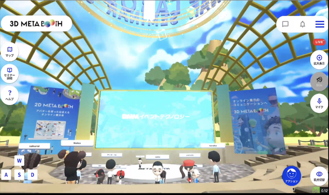 「3D META BOOTH」は、専用の3D空間内の展示エリアで自社サービスを紹介、セミナー会場で講演ができるイベントプラットフォームです。
