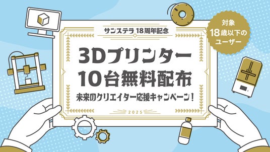 株式会社サンステラ は、創業18周年・3Dプリンター事業13周年を記念し、合計10名の学生クリエイターに3Dプリンターを無料で提供するキャンペーンを開催。 3Dデータを作成できるユーザー対象。