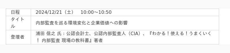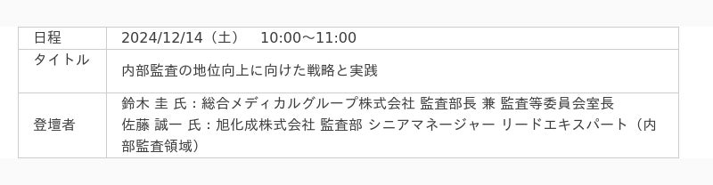 本イベントでは、各領域で活躍する実務家が登壇し、最新のトレンドや直面する課題、そして未来に向けた取り組みを議論。2025年1月から施行されるグローバル内部監査基準など、変革期におけるガバナンスの在り方や組織全体の透明性・信頼性をどう高めていくか、実務に基づいた洞察を解説します。