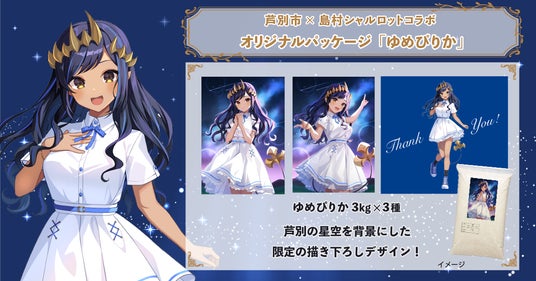 芦別市の農家で大切に育てられた北海道米「ゆめぴりか」は、ふっくらとした粒と濃厚な甘みが特徴で、多くの人に愛されるプレミアムなブランド米です。今回のコラボレーションに合わせて、島村シャルロットのイラストを使用した特別なオリジナルパッケージを制作しました。パッケージには芦別市の魅力を存分に伝えるデザインが施され、贈り物としても最適です。ぜひ、この機会に島村シャルロットとのコラボパッケージで提供される芦別市の「ゆめぴりか」をご賞味ください。