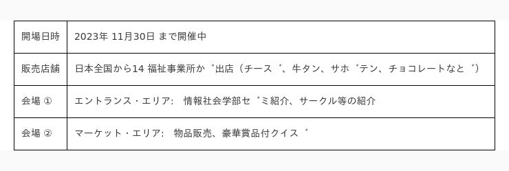 情報社会学部では2021年から複数の福祉事業所の自主製品を集めた販売会「くすのきエール・マルシェ」を 2カ月に 1回程度開催していましたが、販売機会や場所には限りがあり継続的なビジネスに展開するには販路拡大が必要という課題を抱えていました。