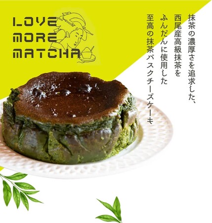 高級抹茶特有の鮮やかな緑色を残すために、丁寧に焼かれた抹茶のバスクチーズケーキ。その一番のこだわりはなんといっても“抹茶”の濃さにあります。西尾の抹茶の特徴は、濃厚なコクと旨味。さらに、上品ながら強い芳香と深く濃い色合いも相まって、お菓子づくりにも最適です。