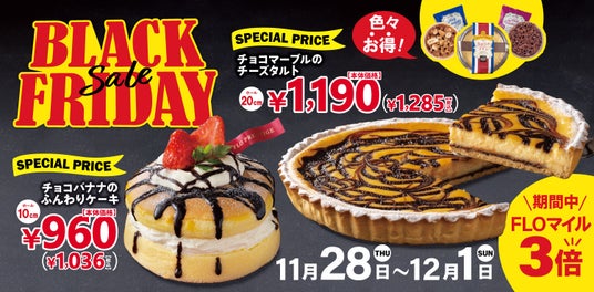関東を中心に洋菓子・洋惣菜のテイクアウトショップ122店舗(2024年10月末現在)を展開する株式会社フロジャポン(本社:東京都武蔵野市)が運営するフロプレステージュでは、2024年11月28日(木)~12月1日(日)の4日間、「FLOのブラックフライデー」を開催いたします。また、同期間中はFLO公式アプリの「FLOマイル3倍」キャンペーンも同時開催!