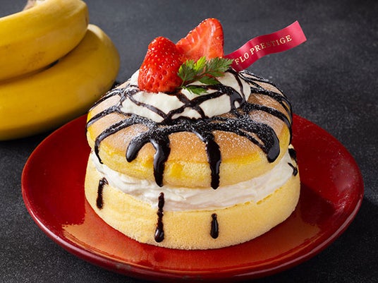 しっとり・ふわふわ食感のスポンジに、マスカルポーネクリームとバナナをサンドし、チョコレートシロップと苺でデコレーションしました。
