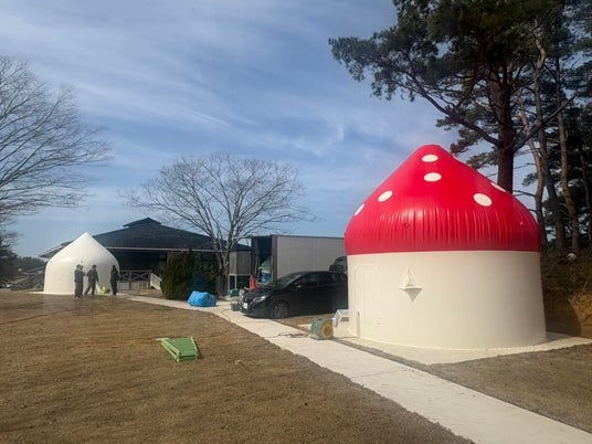 続いて、能登町にある自然に囲まれた広大な公園、「柳田植物公園」にお邪魔しました。対応いただいたのは合同会社能登みらい創造ネットワークの竹内さんです。震災後に能登の賑わいを取り戻そうと、様々な施策に取り組まれています。ちょうど私たちが訪問した日はキノコ型のテントが設置中でした。実はこれ、震災時に避難所の個室スペースとして活用された「インスタントハウス」なんです。仮設住宅と比べて簡単に持ち運びできる資材で1日で建てられる優れモノで、断熱材を吹き付けて固める構造のため、冬でも暖かく過ごせるのが特徴です。この公園では、復興のシンボルである「インスタントハウス」を子供が喜ぶキノコ型に改良したものを4つ建設し、家族が宿泊できる施設として活用する計画が進められています。また能登町は夜空の明るさ調査で日本一を誇る星空を有しています。竹内さんからは、星空と光のイベントを通じて奥能登に誘客をする施策案についてもご説明していただきました。