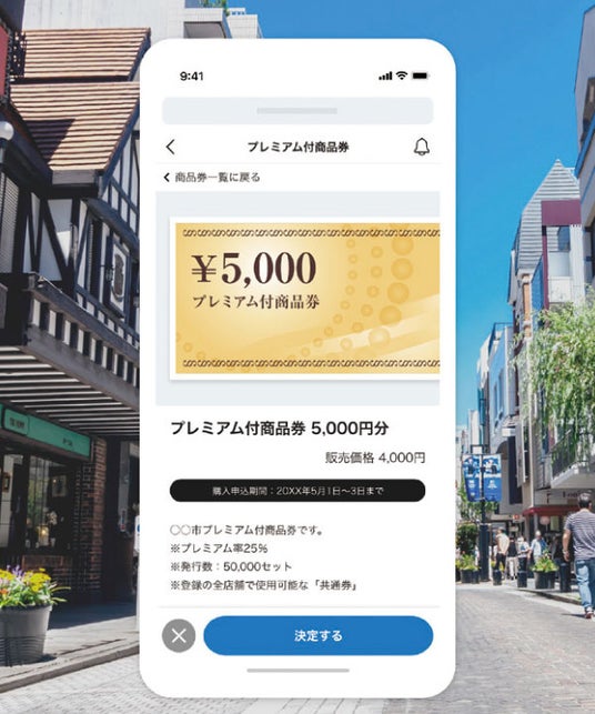 モバイル商品券アプリの画面(地域活性化を促進するデジタルプレミアム商品券の購入画面)