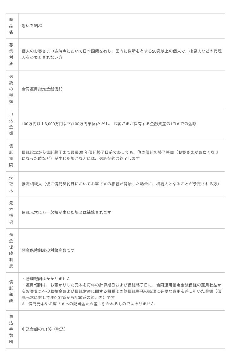 遺言代用信託とは、遺言書を作成いただくことなく、お客さまに相続が発生した際に、お預かりした金銭をあらかじめ指定いただいたご家族などの受取人にお渡しする商品です。