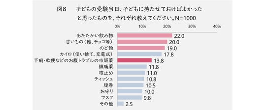 受験当日に子どもに持たせておけばよかったものについて質問したところ(図8)、1位「あたたかい飲み物(22.0%)」、2位「甘いもの(飴、チョコ等)(20.0%)」、3位「のど飴(19.0%)」という結果になりました。受験シーズンは季節的に寒く乾燥する時期ということもあり、「あたたかい飲み物」や「のど飴」が好まれるようです。また、脳に良い影響を与えるイメージのある、糖分を含む「甘いもの」についても人気が高く、子どもが少しでも良いパフォーマンスを発揮できるように後押ししたい、という親心がうかがえます。
