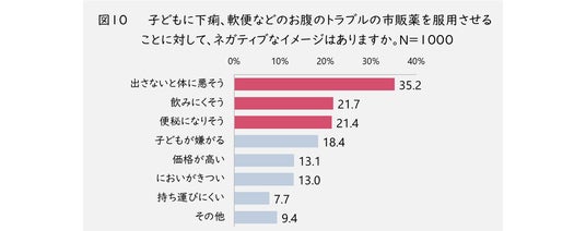 子どもに下痢止めを服用させることに対してのネガティブなイメージについては(図10)、1位「出さないと体に悪そう」、2位「飲みにくそう」、3位「便秘になりそう」といったイメージを抱いている人が多いことが分かりました。