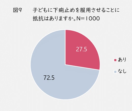 子どもに下痢止めを服用させることに抵抗はあるか質問したところ(図9)、抵抗が「ある」と回答した人は27.5%、「ない」と回答した人は72.5%でした。大半の人が抵抗はないと考えていることが分かりましたが、まだ4人に1人以上は子どもに下痢止めを服用させることに対して抵抗があるようです。