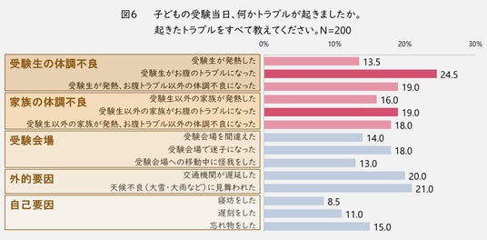 さらに、受験生、他の家族どちらの体調不良のなかでも(図6)、下痢などの「お腹のトラブル」が最も多く、特に「受験生のお腹のトラブル」は当日起こったトラブルの中で最も多い結果となりました。