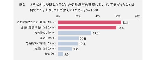 不安だったことは(図3)、1位「力を発揮できるか・緊張しないか(63.4%)」、2位「当日に体調不良にならないか(58.6%)」が、3位「忘れ物をしないか(33.3%)」と20%以上の差をつけ、上位の結果となりました。子どもには、精神・体調共に万全の状態で臨んでほしいと考える人が多いようです。