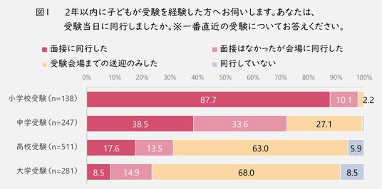 2年以内に子どもの受験を経験した保護者に、受験当日に同行したかどうかを伺ったところ(図1)、同行した人(「面接に同行した」「面接はなかったが会場に同行した」と回答した人の合計)の割合は、子供の年齢が上がるにつれ減少傾向でした。しかし、送迎のみを含めると、大学受験でも9割以上の保護者が会場まで同行もしくは送迎をしていたことが分かりました。小・中学受験は同行する人が7割以上ですが、高校・大学受験は送迎のみが6割以上で最も多いという結果でした。小・中・高・大と子どもが成長するにつれ、保護者自身が面接に同行する割合は低くなっていきますが、送迎だけを含めると、大学受験でも91.4%と、9割以上の保護者が子どもの受験当日に一緒に会場まで行っており、少しでも子どものサポートをしたいという、親心がうかがえます。