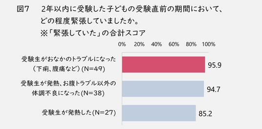 受験生の体調不良と緊張度合いを突き合わせて見てみたところ(図7)、受験生のお腹トラブルを選択した人は、受験生が緊張していたと回答した人の割合が、最も高いことが分かりました。95.9%と、お腹トラブルになっている人のうちほとんどが緊張していたと回答していたことから、受験当日のお腹トラブルは、緊張によるストレスが一因となってしまった可能性が考えられます。