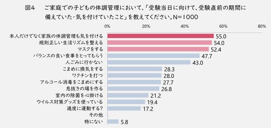 子どもの体調管理について、当日に向けて気を付けていたことについて質問したところ(図4)、1位は「本人だけでなく家族の体調も気を付ける(55.0%)」、2位「規則正しい生活リズムを整える(54.0%)」、3位「マスクをする(52.4%)」でした。受験生本人の体調管理を徹底するのはもちろんですが、そのためには本人だけでなく他の家族の体調も気を付ける必要がある、と考える人が最も多いという結果になりました。受験は受験生本人だけの問題ではなく、家族一丸となって取り組む一大イベントであるということが分かります。