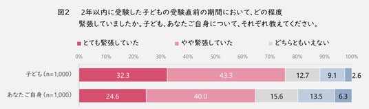 受験直前の期間の緊張については(図2)、保護者からみて子どもは緊張していたと回答した人(「とても緊張していた」と「やや緊張していた」の合計)は、75.6%と4人に3人は子どもが緊張していたと考えていたことが分かりました。さらに保護者自身も緊張していたと回答した人は66.6%と、保護者も6割以上が緊張していたという結果になりました。