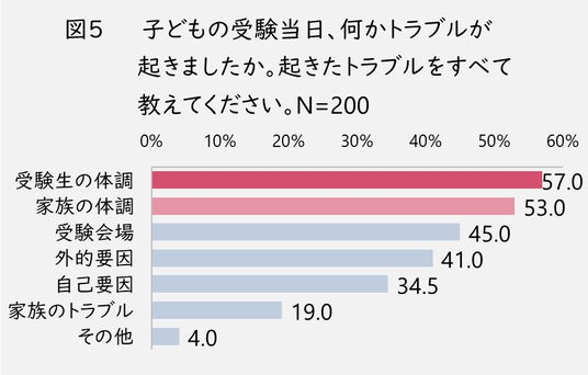 4.受験当日に起きたトラブル1位は「受験生の体調不良」、2位は「家族の体調不良」。