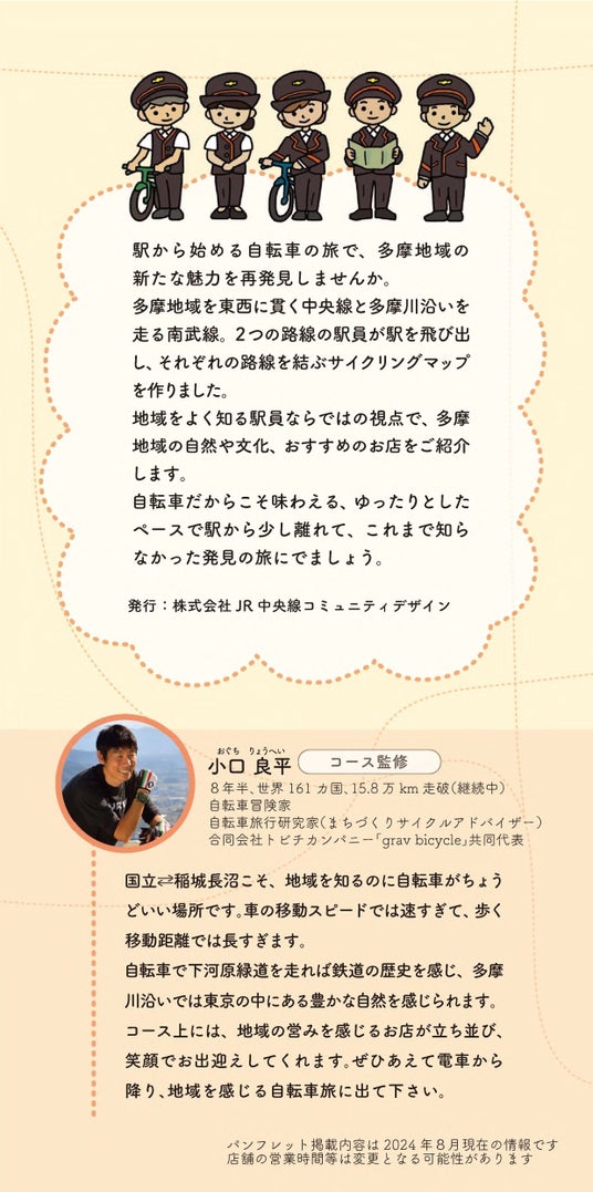 普段は南武線の稲城長沼駅、中央線の武蔵境駅・東小金井駅・西国分寺駅・国立駅と異なる駅で働く若手の駅社員5名がプロジェクトを組み、それぞれの路線を結ぶサイクリングマップを作成しました。地域をよく知る駅社員ならではの視点で多摩地域の自然や文化、おすすめのお店を紹介します。
