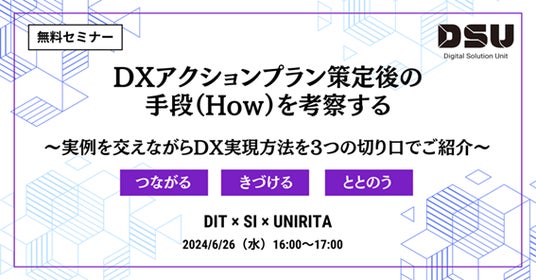 株式会社システムインテグレータ(本社:さいたま市中央区、代表取締役社長:引屋敷 智、東証スタンダード:証券コード3826)は、デジタル・インフォメーション・テクノロジー株式会社(本社:東京都中央区、代表取締役社長:市川 聡、東証プライム:証券コード3916)と株式会社ユニリタ(本社:東京都港区、代表取締役 社長執行役員:北野 裕行、東証スタンダード:証券コード3800)との3社共催で、「DXアクションプラン策定後の手段(How)を考察する~実例を交えながらDX実現方法を3つの切り口でご紹介~」と題した無料ウェビナーを、2024年6月26日(水)に開催することをお知らせします。