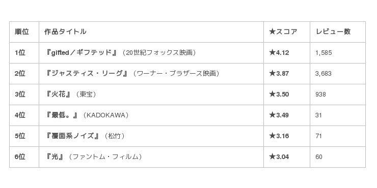 株式会社つみき(代表取締役社長:鈴木貴幸、本社:東京都目黒区)が運営する国内最大級の映画レビューサービス「Filmarks(フィルマークス)」は、サービス内のデータに基づいた「2017年11月第4週上映スタート映画の初日満足度ランキング」を発表いたしました。