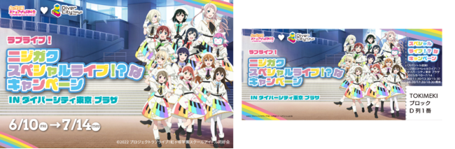2022年6月10日(金)~7月14日(木)までの期間、ダイバーシティ東京 プラザ館内各所のデジタルサイネージで作品に登場するメンバーのダンスシーン映像を毎日放映します。また、館内店舗でお買物やお食事をいただくと、オリジナルライブチケット風カード(全13種類ランダム)をプレゼント。館内には、『ラブライブ!虹ヶ咲学園スクールアイドル同好会』TVアニメ2期のメンバー全員が等身大パネルで登場します。ダイバーシティ東京プラザ館内でニジガクの世界を楽しもう!