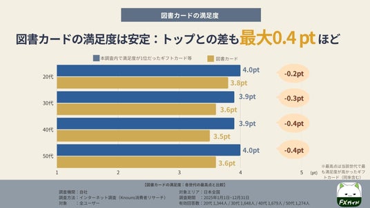 また、各世代で最も満足度が高かったギフトカード(最高点:3.9~4.0pt)と比較しても、図書カードとの差は-0.2~-0.4ptにとどまりました。トップとの差が最大でも0.4pt程度に収まっていることから、図書カードは“上位に近い定番ギフト”として一定の評価を得ていることが読み取れます。